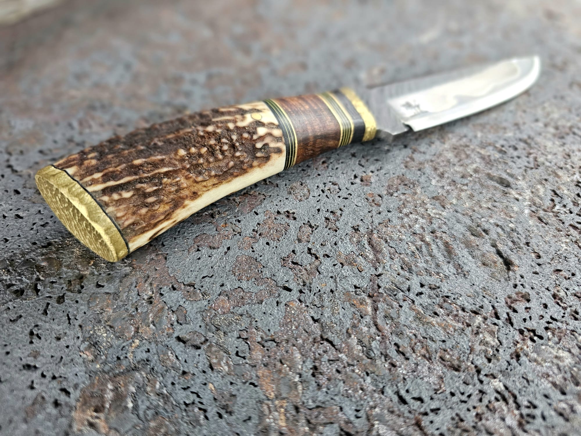 Der Griff ist kombiniert aus Parierstück aus Messing/Ebenholz/Messing/Mikartagrün-gelb/Messing/Koaholz/Messing/Mikartagrün-gelb/Vulcanfiber schwarz/Geweih vom Rothirsch/Vulcanfiber schwarz/Messingendstück