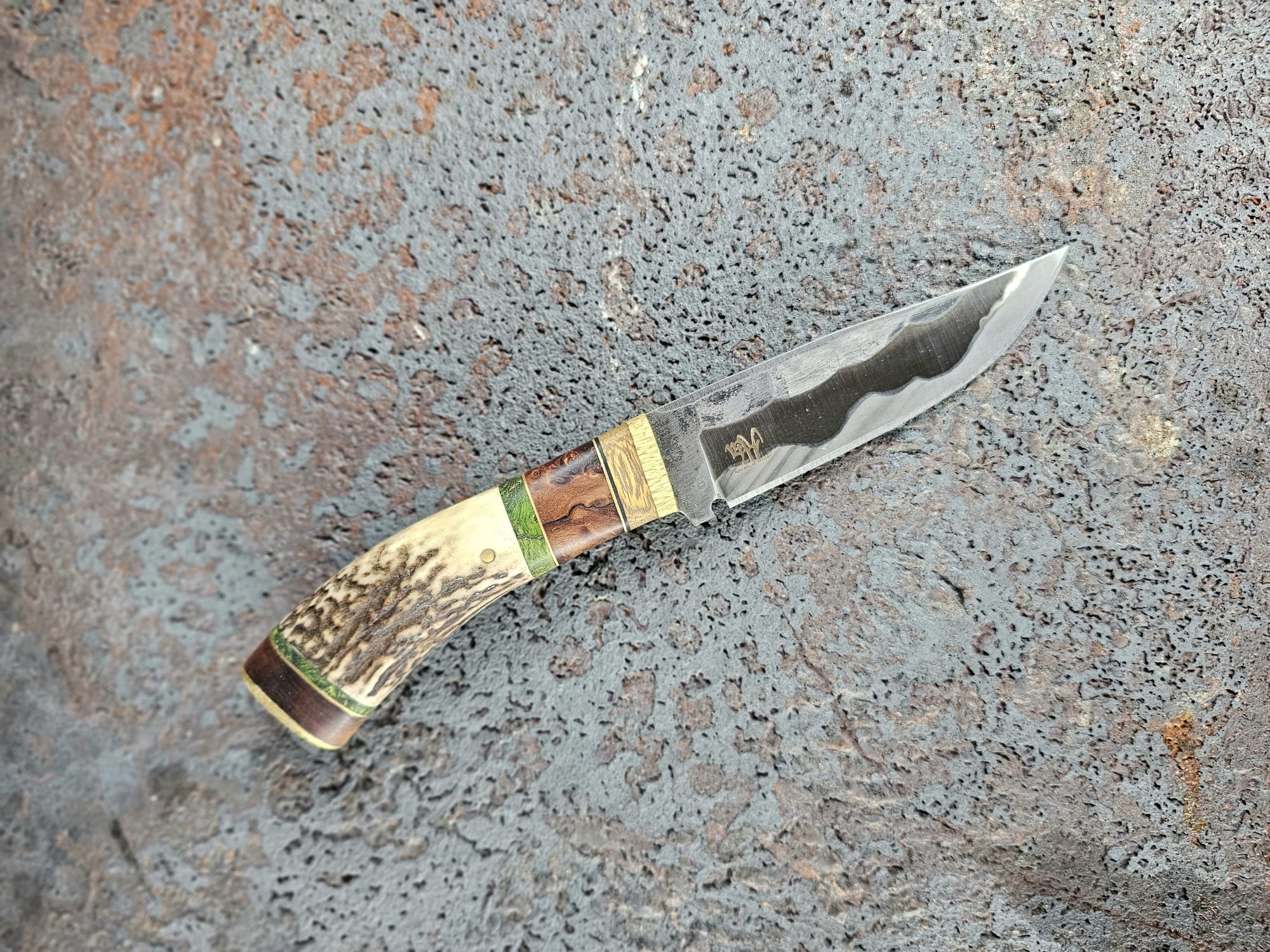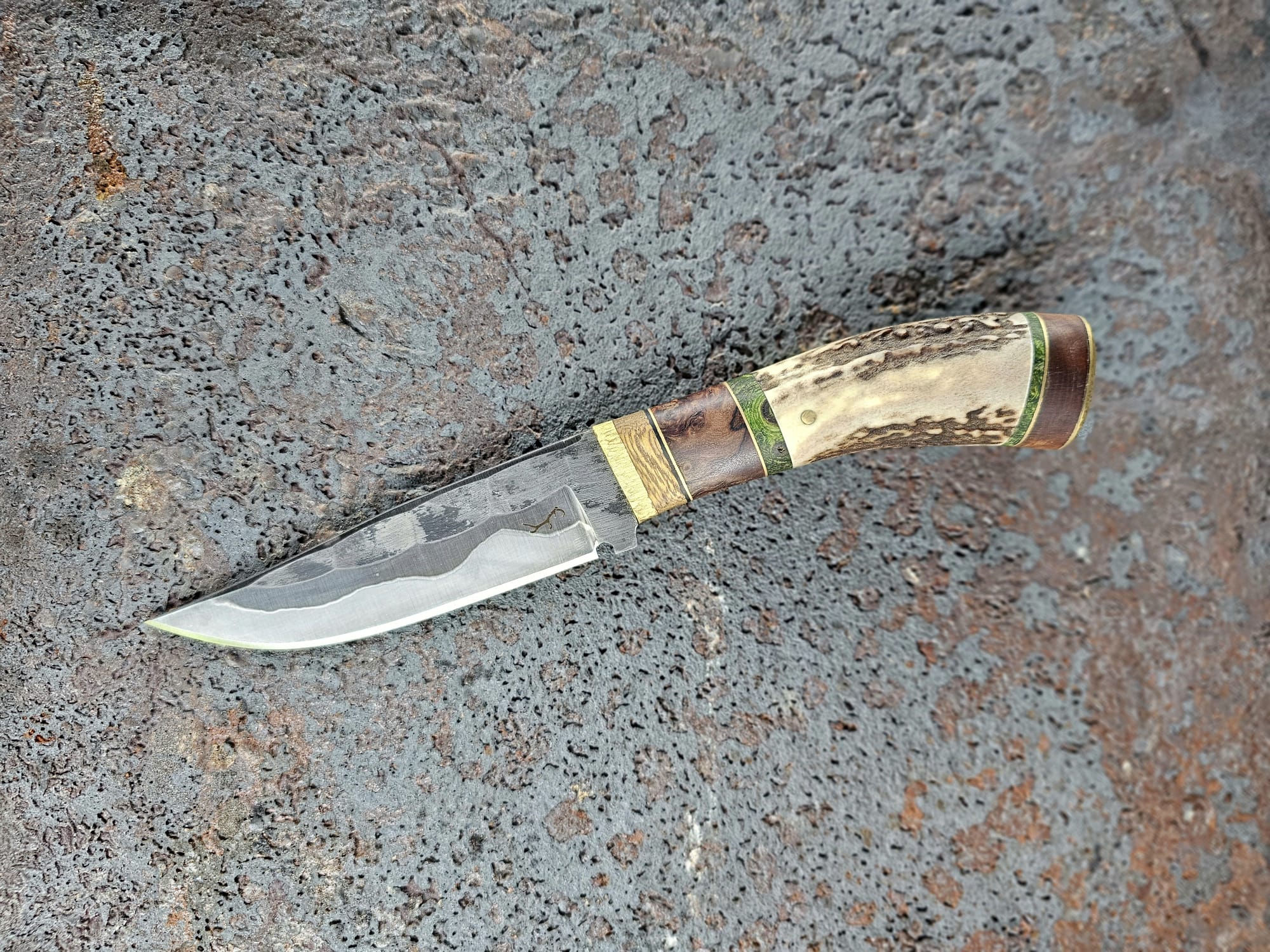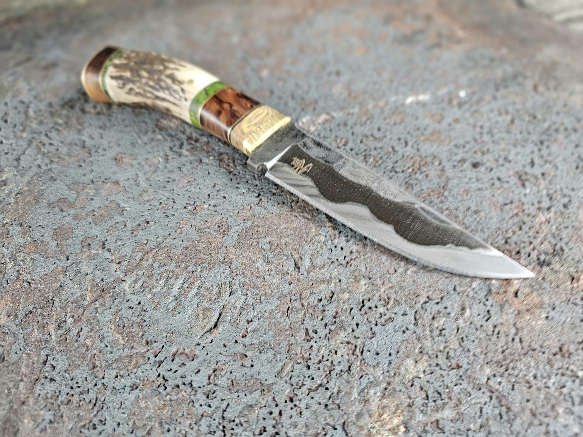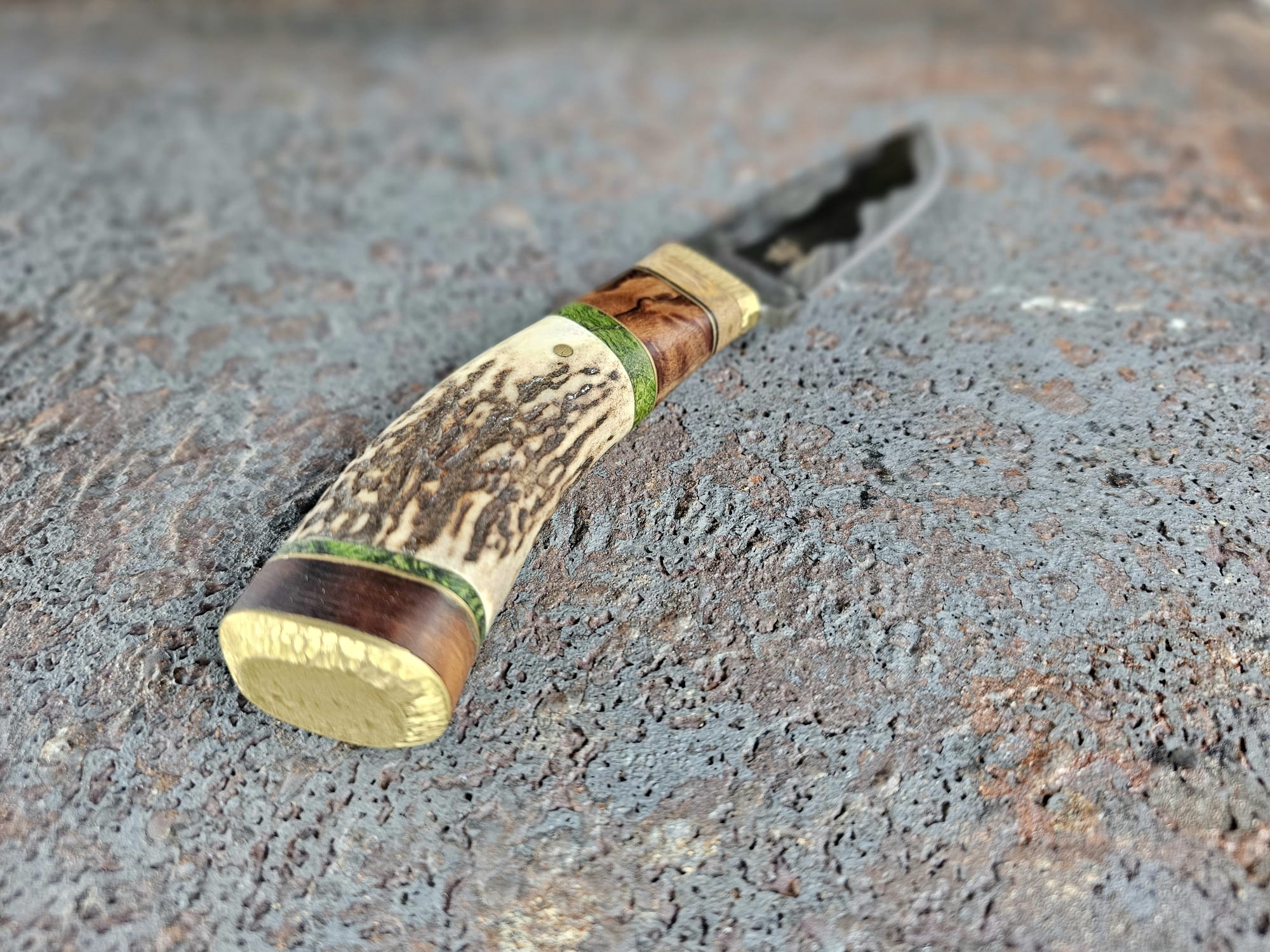 Der Griff ist kombiniert aus Parierstück aus Messing/Johannesbrotbaumholz/Vulcanfiberschwarz/Messing/Walnussholz Maser, stabilisiert/Messing/Pappelholt Maser, stabilisiert grün/Geweih vom Rothirsch/Pappelholz Maser, stabilisiert grün/Messing/Walnusswurzelholz/Messingendstück