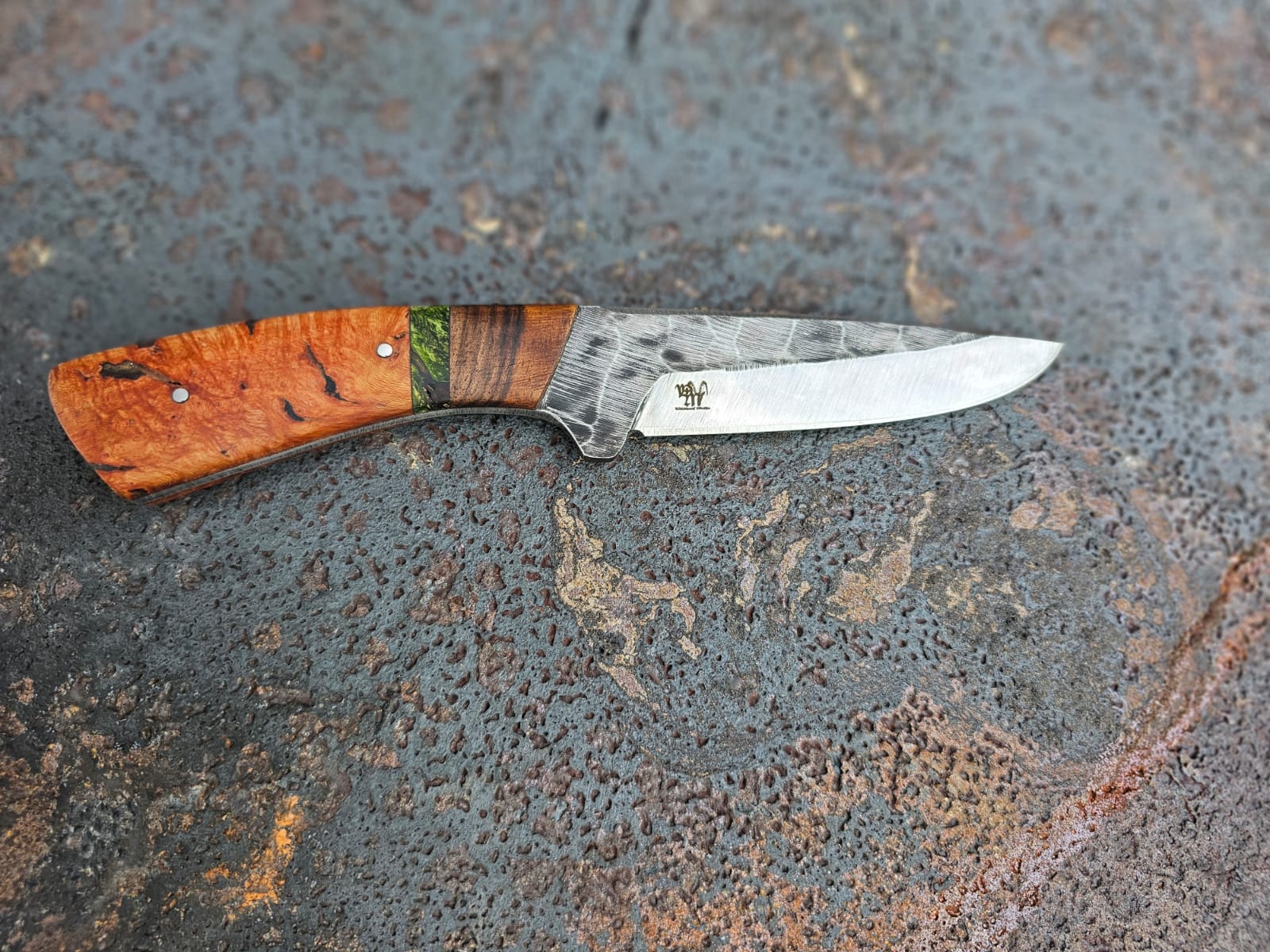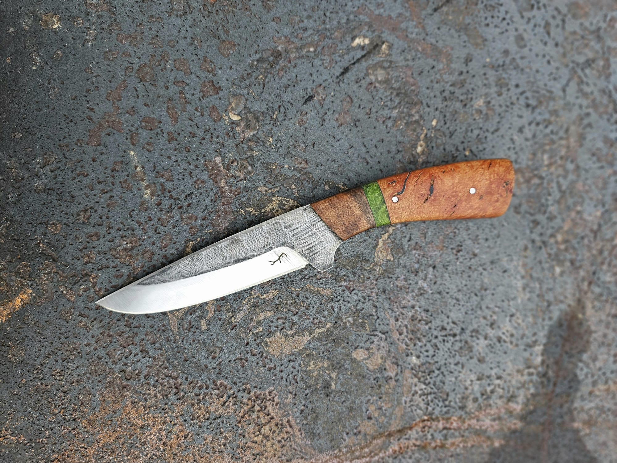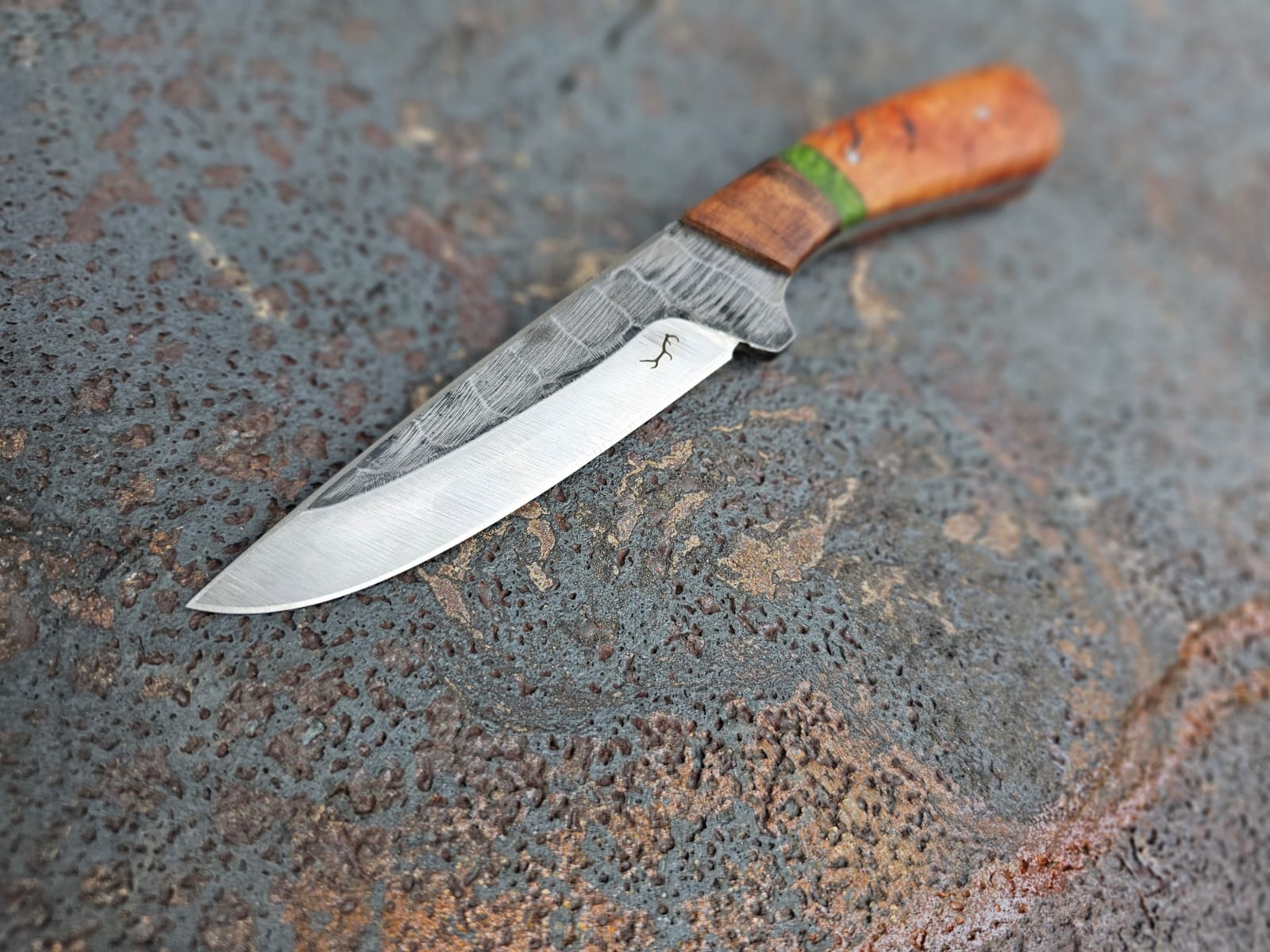 Der Griff ist kombiniert aus kaukasischem Nussholz/Pappel Maser, stabilisiert grün/Baumheide
