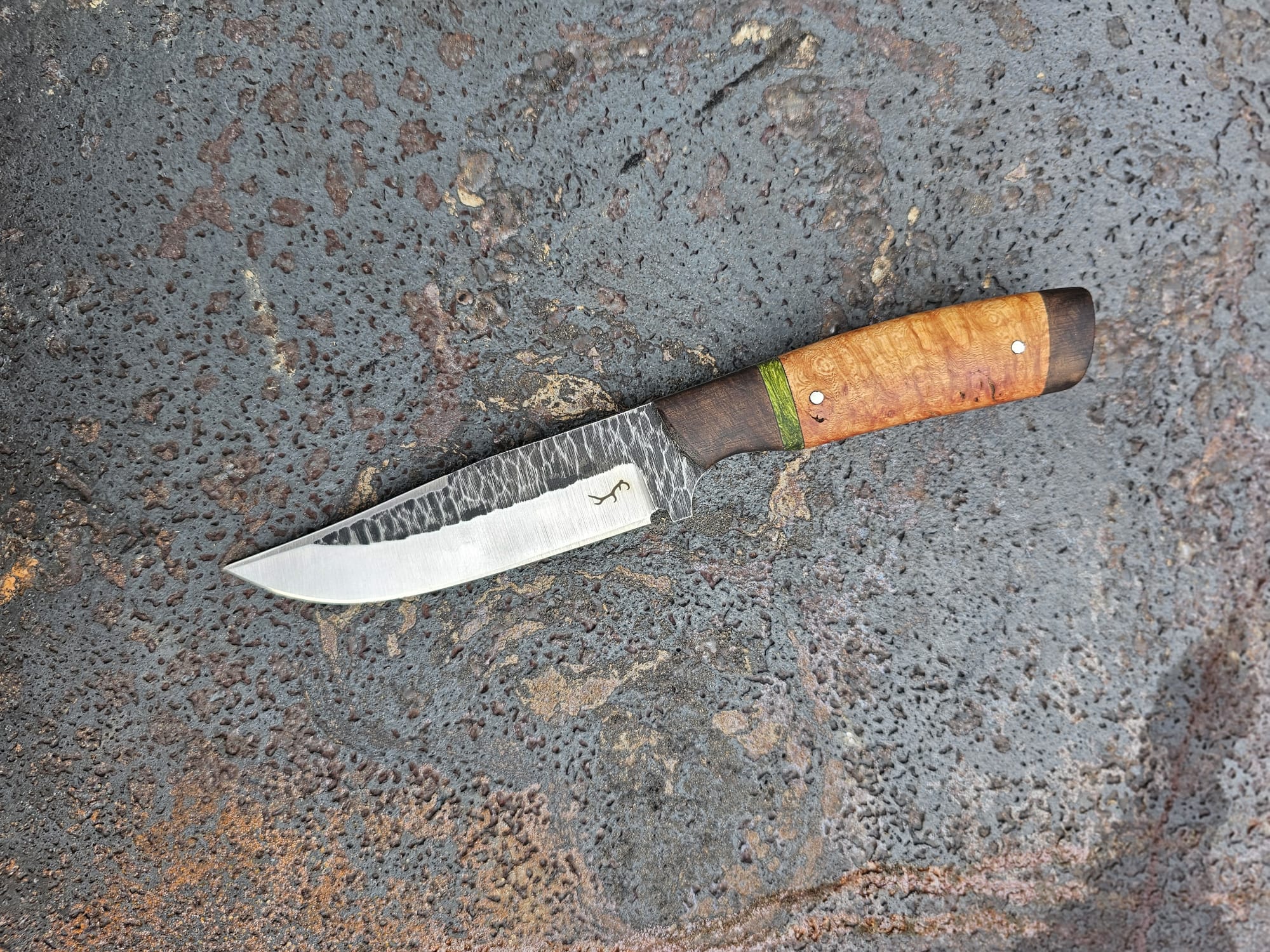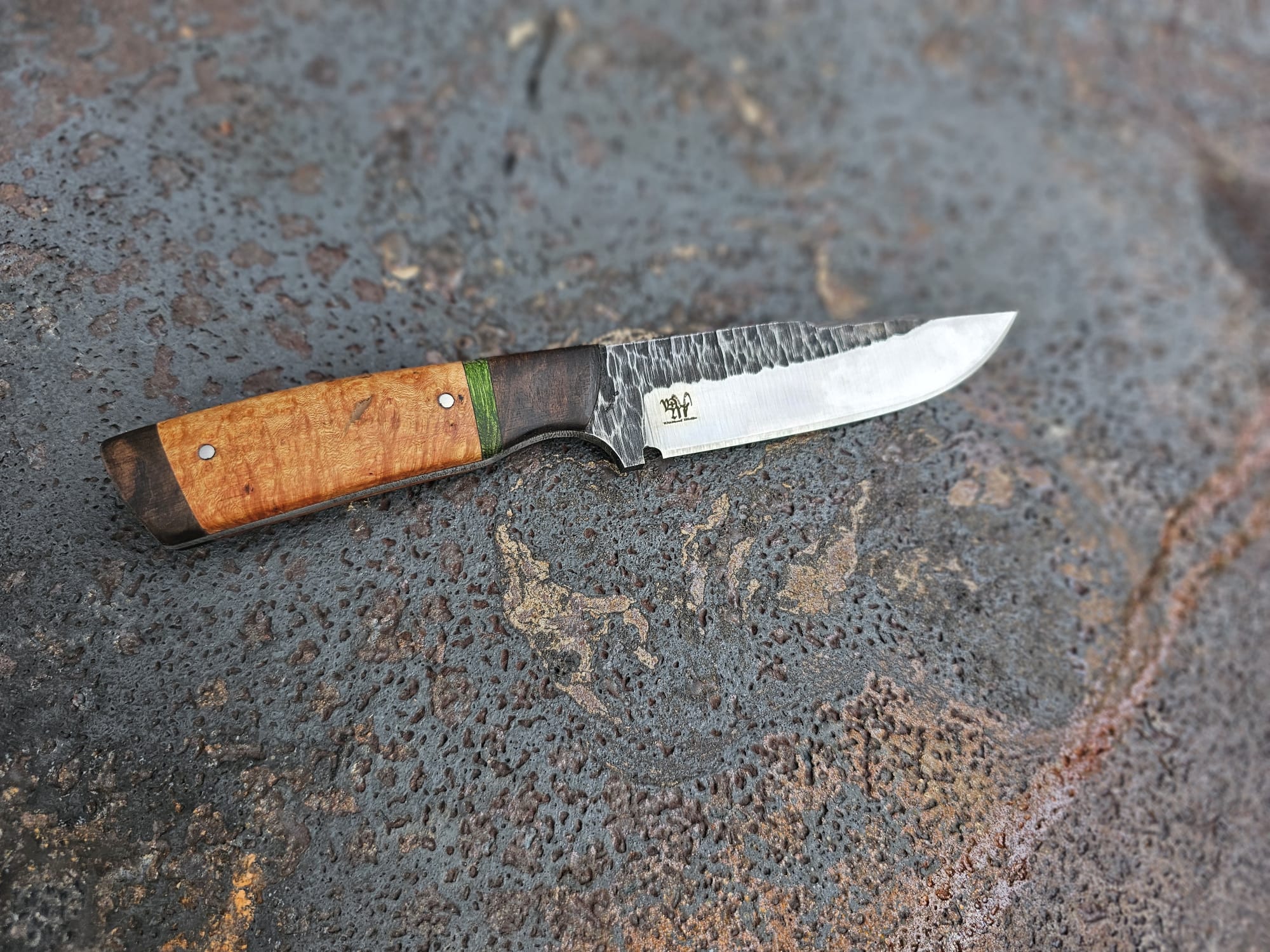 Der Griff ist kombiniert aus kaukasischem Nussholz/Pappel Maser, stabilisiert grün/Baumheide/kaukasisches Nussholz.